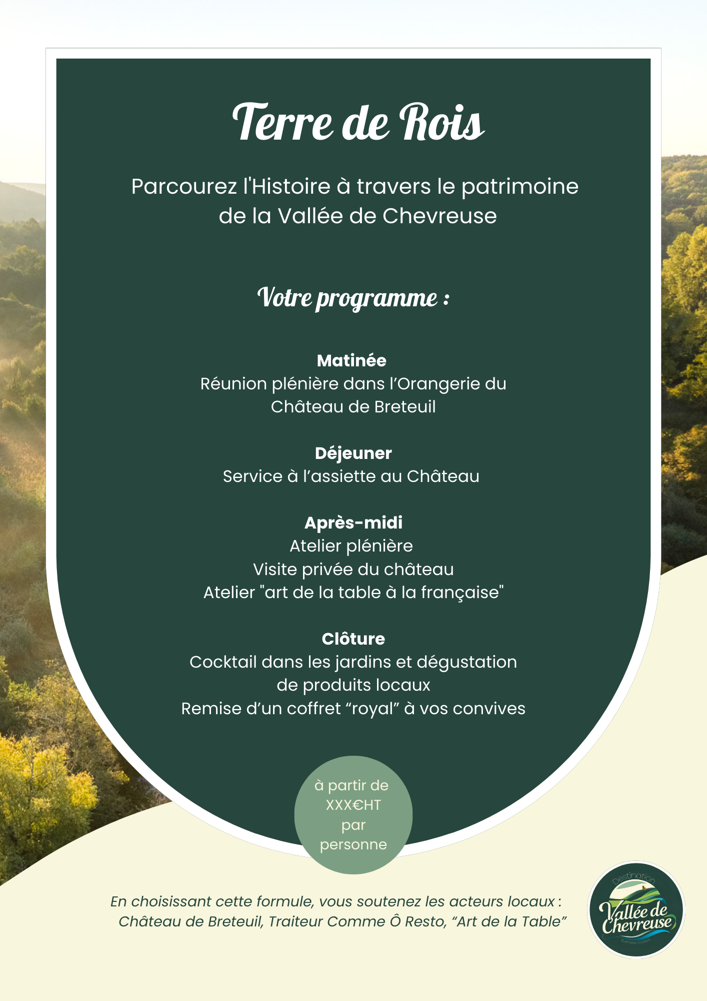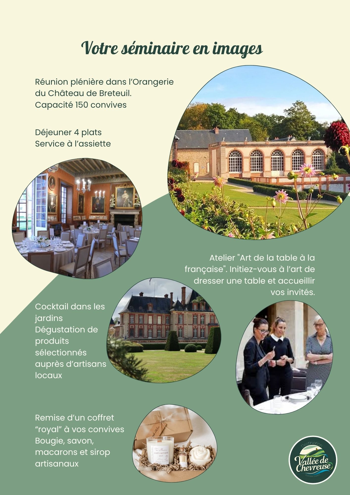Plongez vos équipes dans l’histoire et le patrimoine de la Vallée de Chevreuse : matinée plénière dans l’Orangerie du Château de Breteuil à Choisel, déjeuner servi au château, après-midi atelier « art de la table à la française » et visite privée du château, clôture par un cocktail dans les jardins et une dégustation de produits locaux. Un coffret « royal » remis à chaque participant. Transport possible pour réduire l’empreinte carbone.